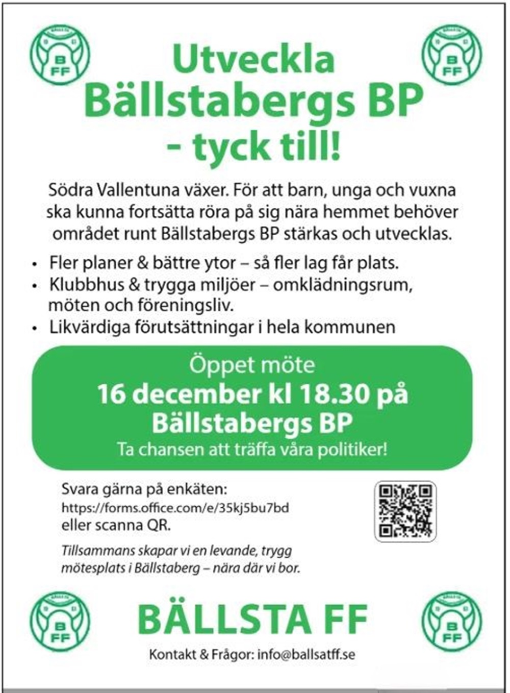 Vi är en breddfotbollsförening med verksamhet för för tjejer och killar på på Bällstabergs BP i södra Vallentuna med över 700 spelare och 140 ledare. Mer om respektive lag kan du läsa på respektive lagsida i spalten uppe till vänster eller läs mer om föreningen under Om klubben.