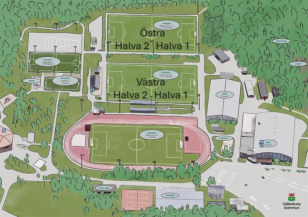Kartbild över Vallentuna IP med namngivning av planer och planhalvor